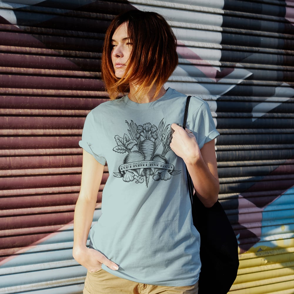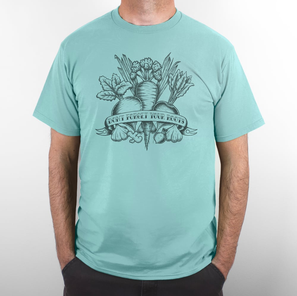 Don't forget the struggle, don't forget the beets. Dark gray ink on dusty blue tee.