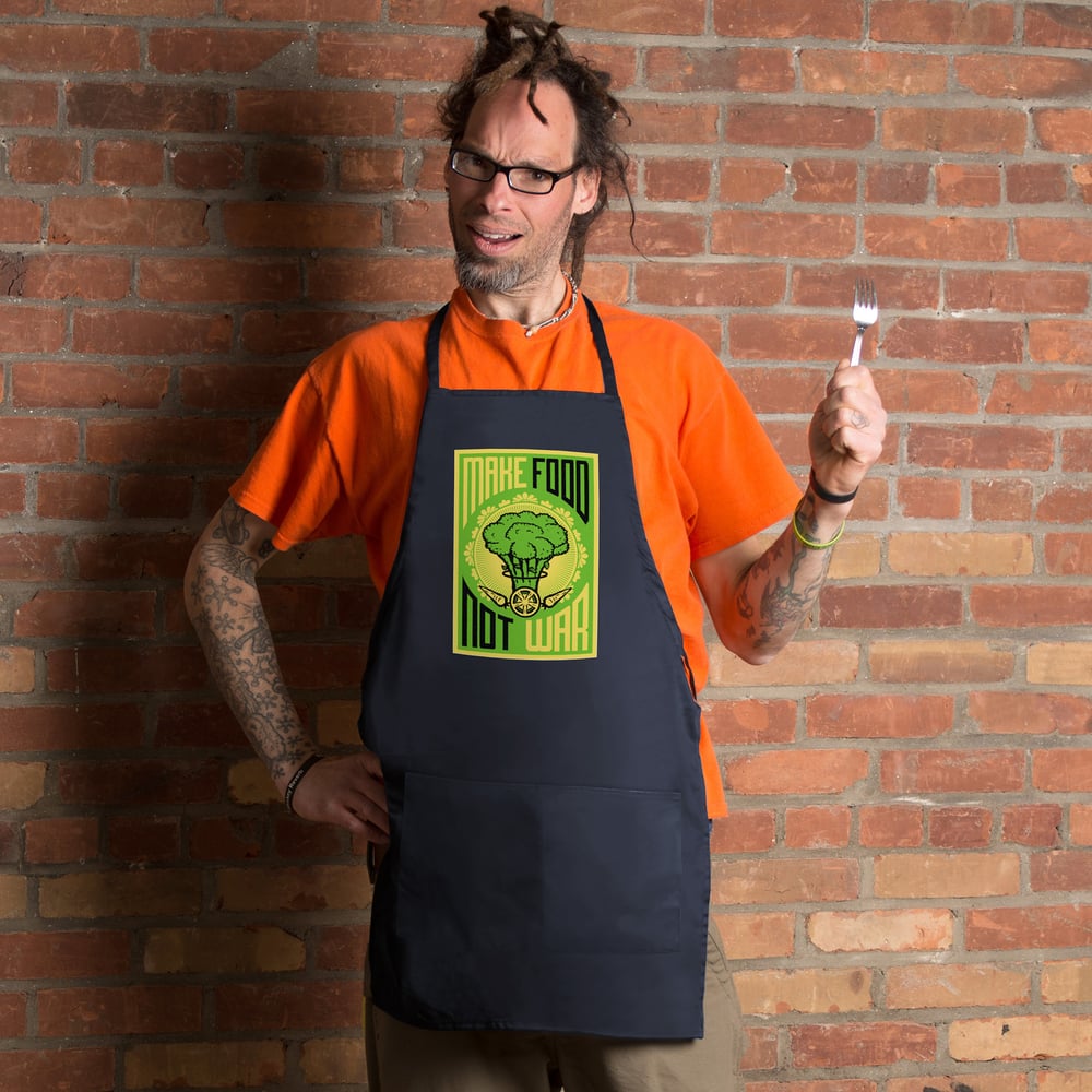 Less uzis, more coulis. Tater tots taste better than bullets anyway. Yellow and green ink on navy blue tee.