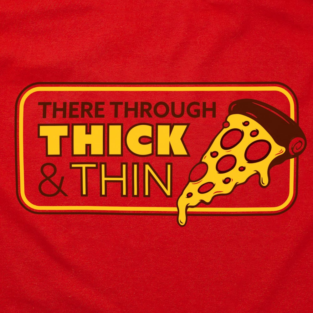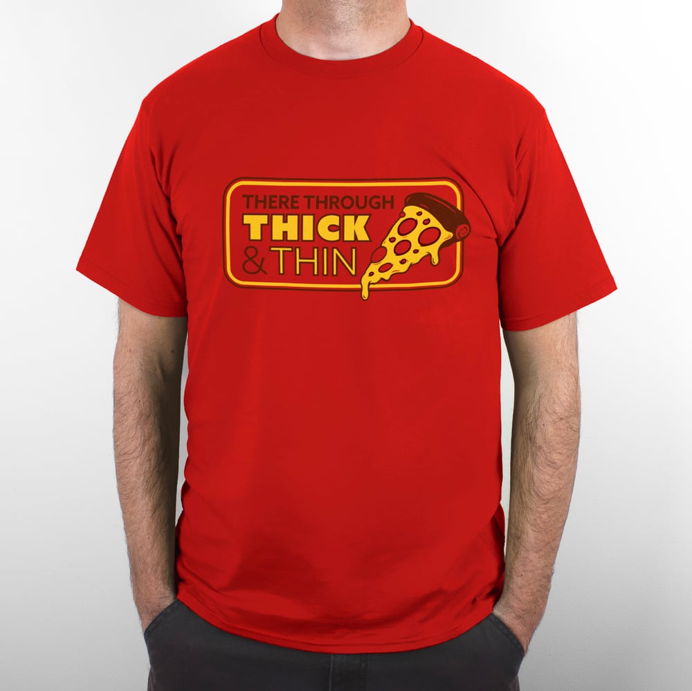 Like a true friend, pizza will always be there for you. May cause excessive cravings, sauce stains, and an insatiable appetite for more pizza! Brown and yellow ink on red tee. Also available as an apron.